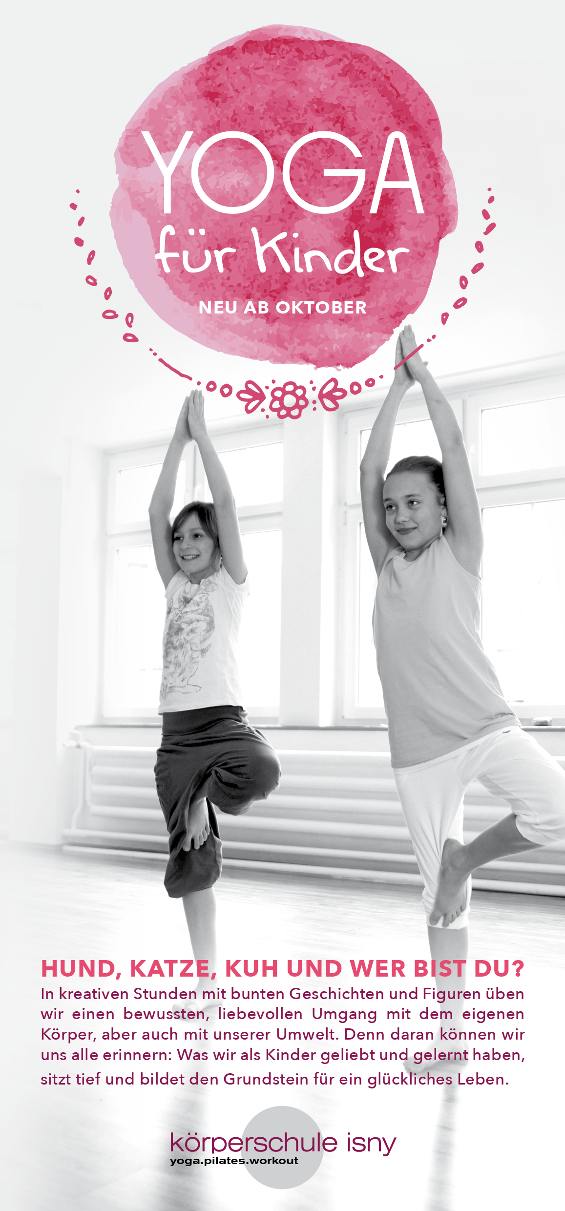Auf spannenden Entdeckungsreisen lernen die Kinder den harmonischen Ausgleich von Aktivität und Erholung, Dynamik und Stille. Was bewirkt das Dehnen und Strecken, das Groß und Klein machen? Wie entsteht Muskelkraft und Ausdauer? Wie fühlt es sich an, wenn Ruhe einkehrt? Unser Hatha-Yoga für Kinder folgt der spielerischen Neugier, sich auszuprobieren. So entstehen positive Erfahrungen, durch die ein gesundes Selbstwertgefühl wachsen kann.